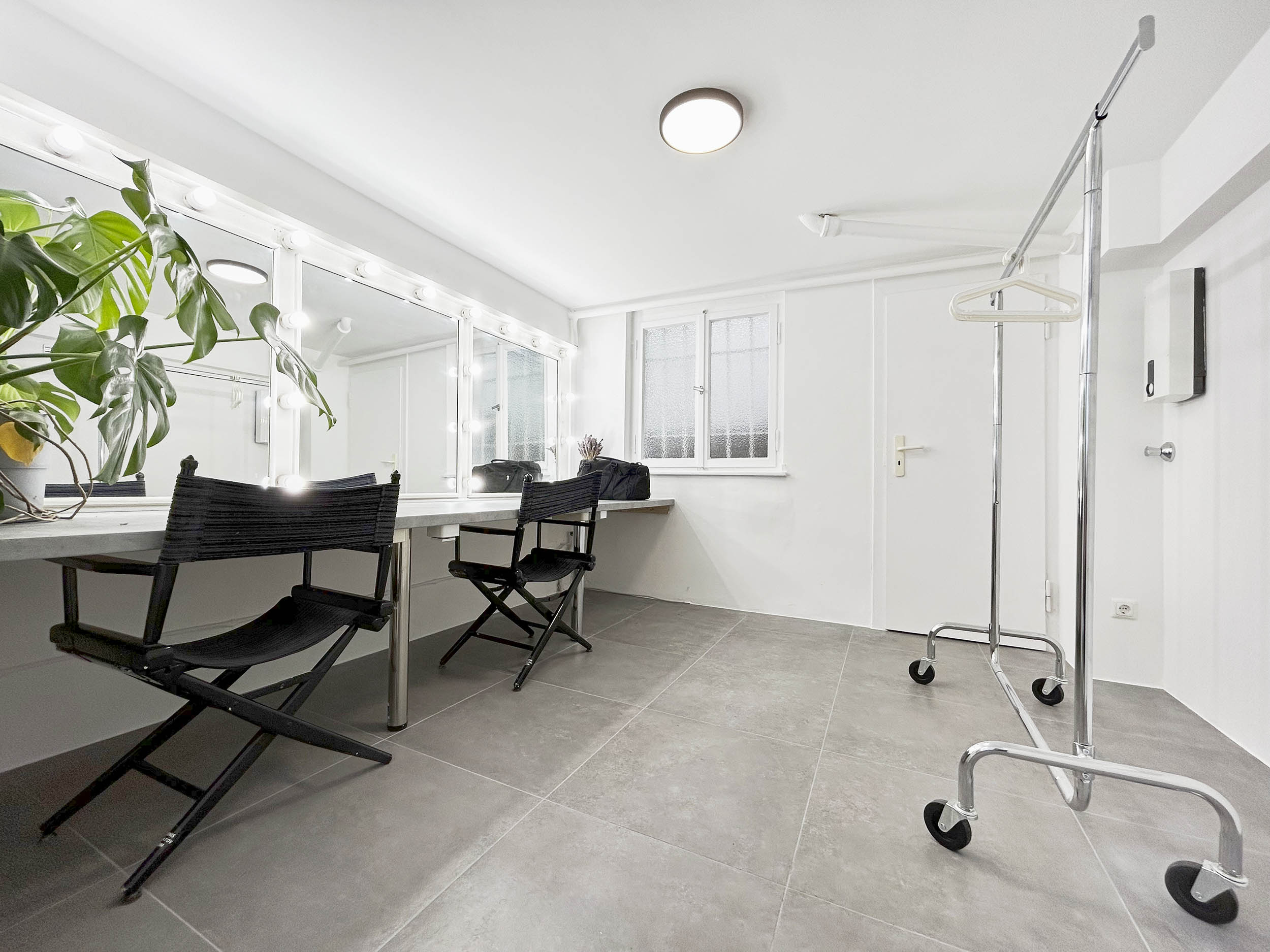 The ground-floor studio in the heart of Düsseldorf has daylight (shading possible), a mask room, high-voltage current, delivery options, a kitchen and a washing room.